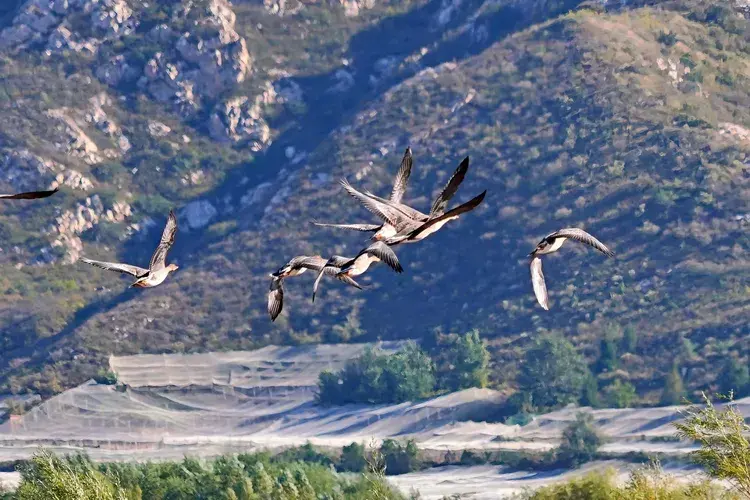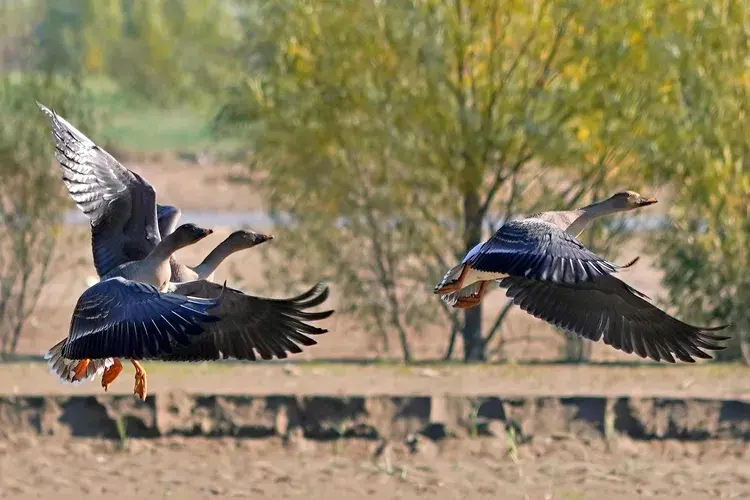 它们的翅膀有力地扇动着,划破空气发出“呼呼”的声响,像是大自然奏响的独特乐章。阳光洒在它们灰褐色的羽毛上,泛着柔和的光泽,橙红色的脚掌在空中微微蜷缩,又随着飞行的节奏舒展,那姿态,既有着迁徙者的坚毅,又透着几分灵动的俏皮。
